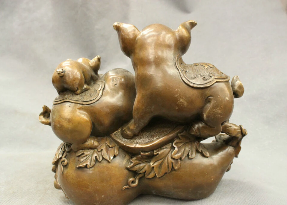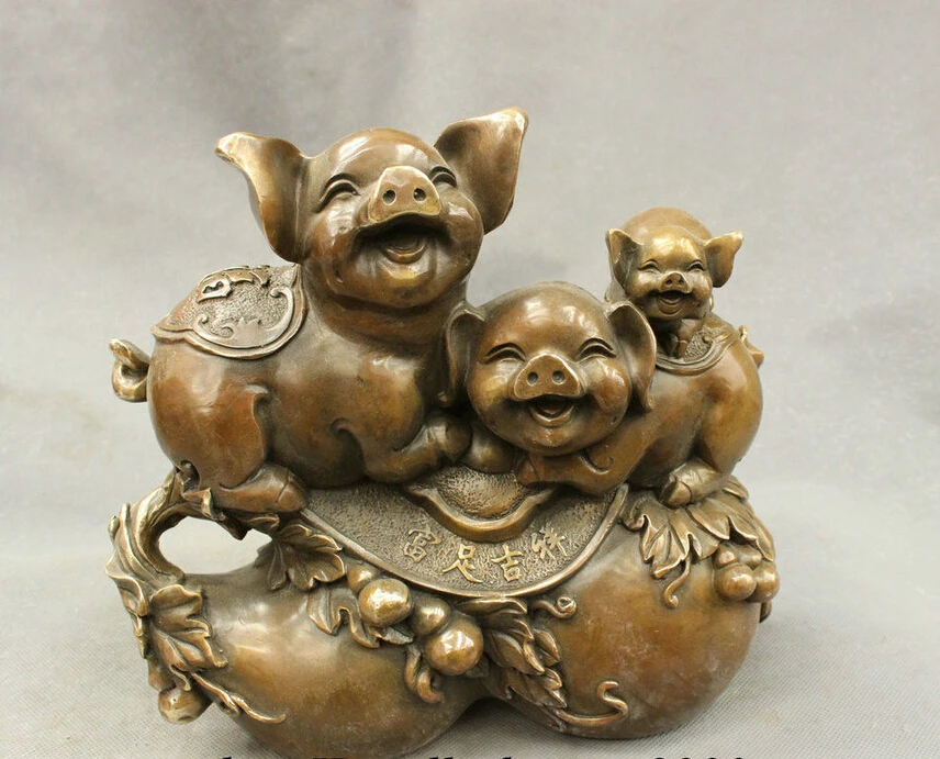BEST QUALITY 10"Chinese Bronze Copper AuspiciouS Zodiac Year 3 Happy Pig Family Goard Statue