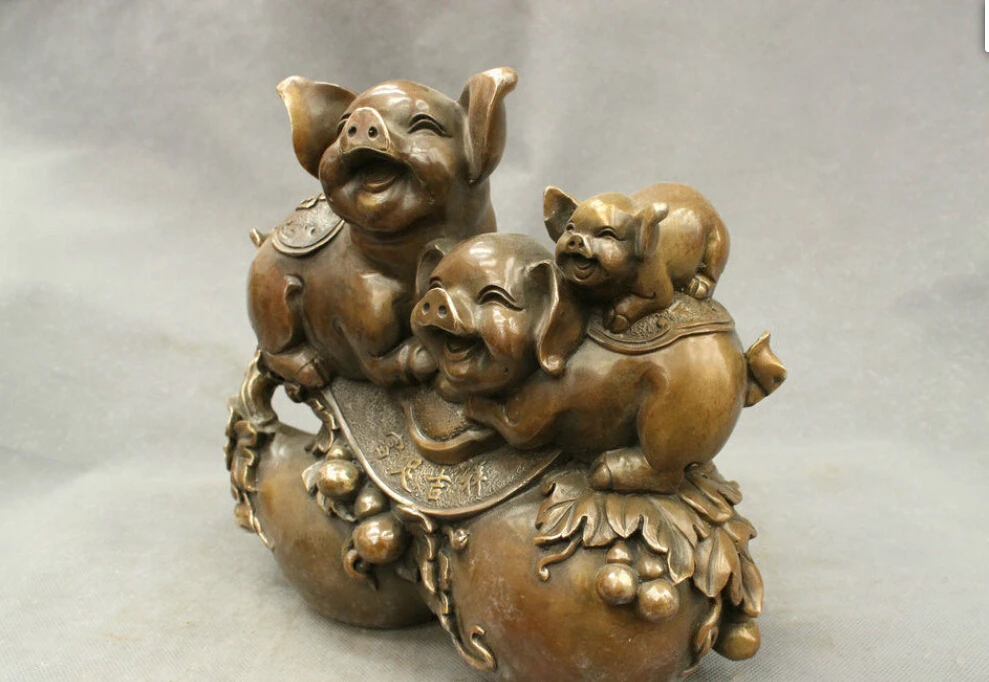 10"Chinese Bronze Copper AuspiciouS Zodiac Year 3 Happy Pig Family Goard Statue