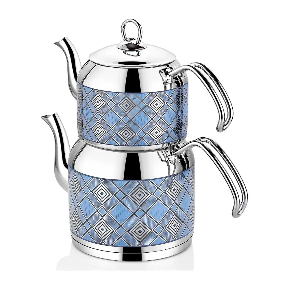 Best Quality FAMILY / BIG SIZE - Turkish Tea Maker BLUE Color Teapot Set 18/10 Cr-Ni Stainless Steel A+ BEST QUA